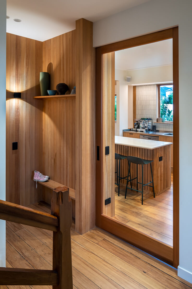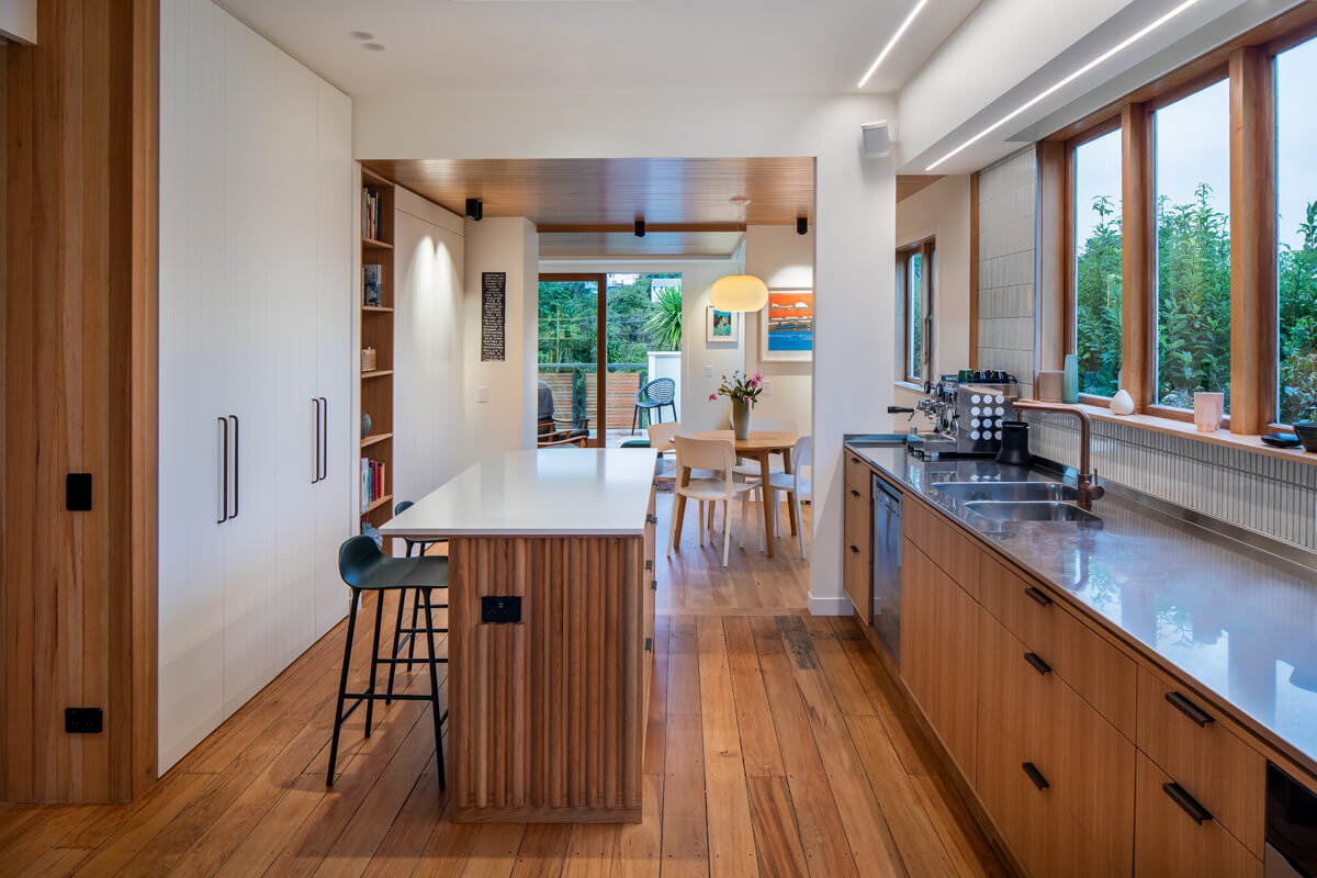 Redesign of an existing contorted entryway created a generous welcoming space, while opening out the kitchen has meant easy movement between key family areas. A kitchen work bench lines one wall, while a central bench provides another work surface and informal eating spot.