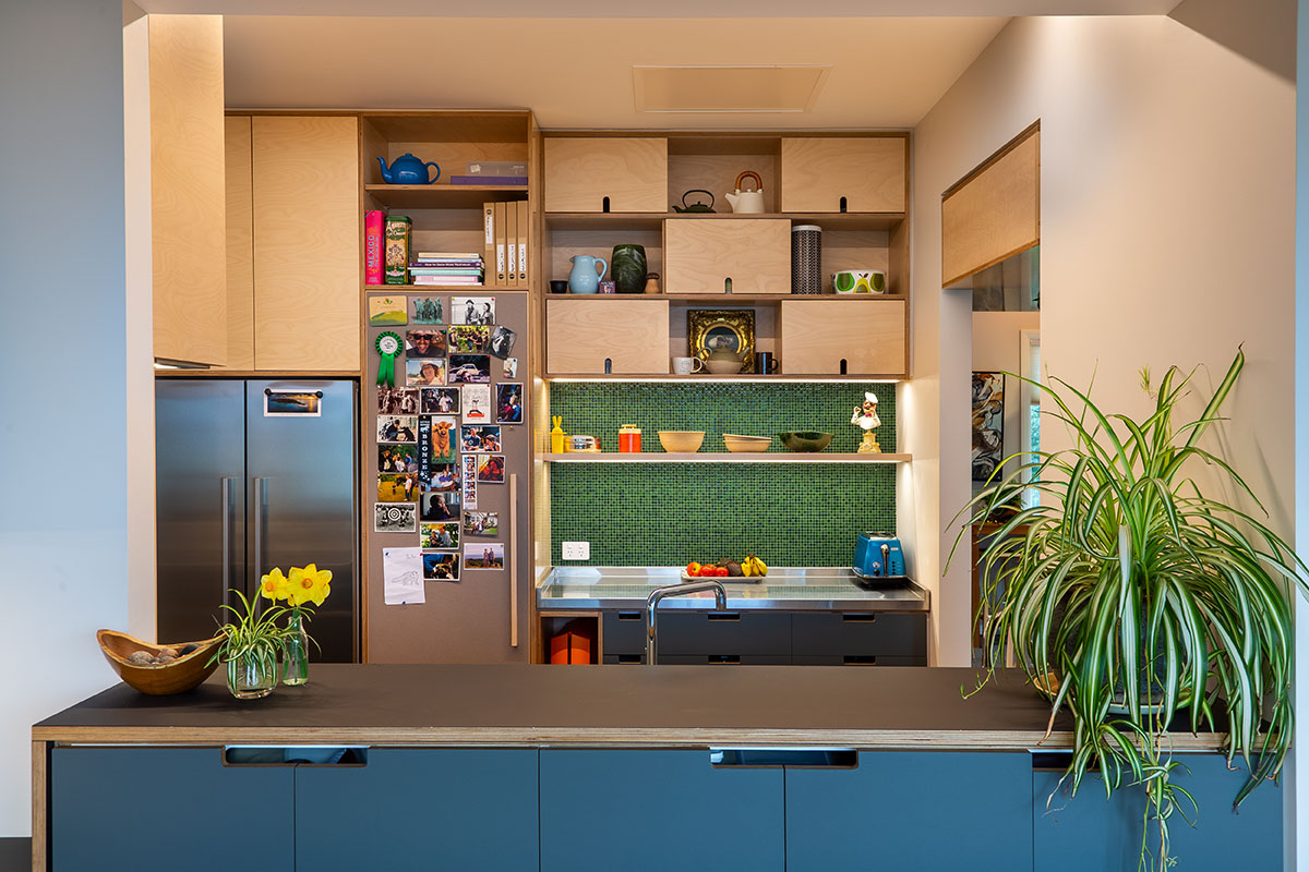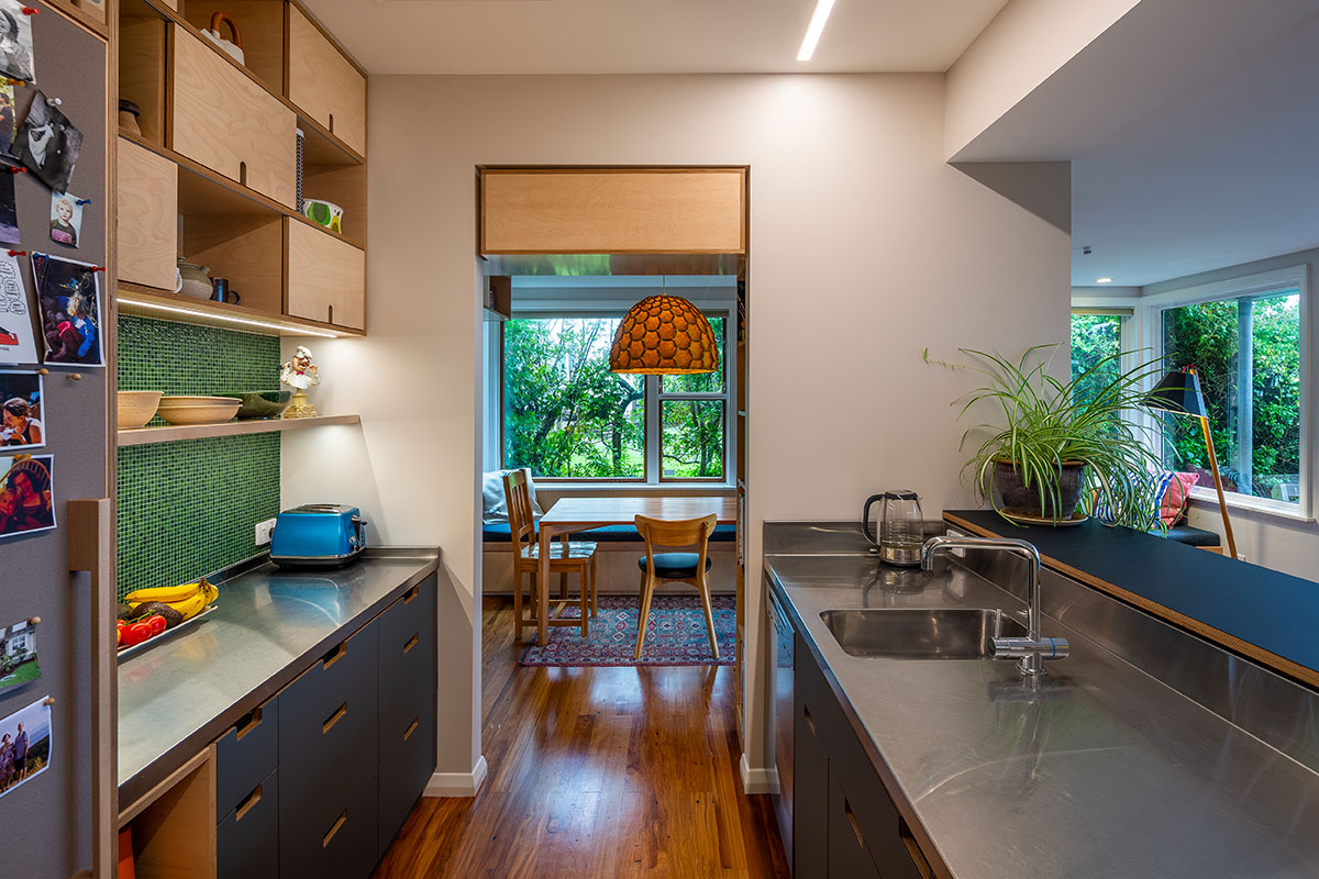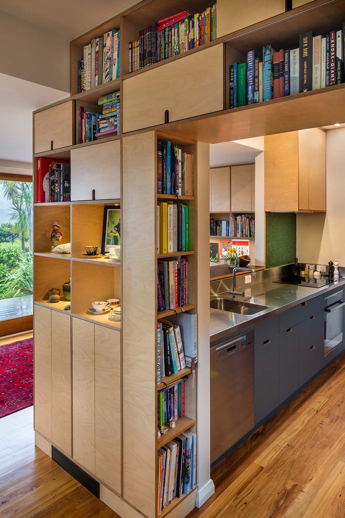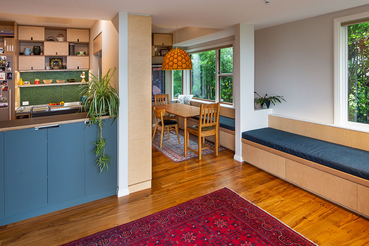 Kitchen, dining room and sitting areas were kept in their original positions, with new benches, storage, study desk, bookcases and window seats added. Careful selection of materials, colour and lighting link the areas and create moments of joy in everyday life.