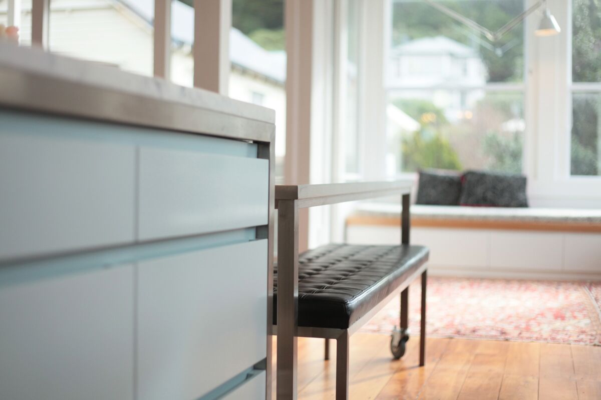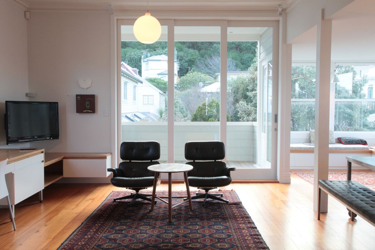 A re-think of the upper level resulted in a suspended contemporary interior space, with kitchen, dining and living areas. A new deck captures afternoon sun and provides garden access, while sliding doors allow the outside in and provide views of the Tinakori Hill.