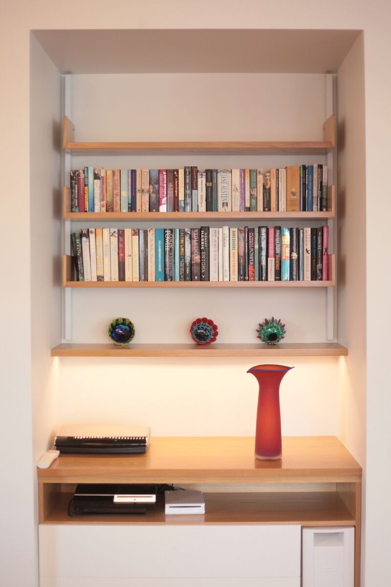 Clever use of sliding panels and built-in joinery units creates separate living areas and a wall originally used as locker storage for the bowling club now houses custom-designed shelving and storage units.
